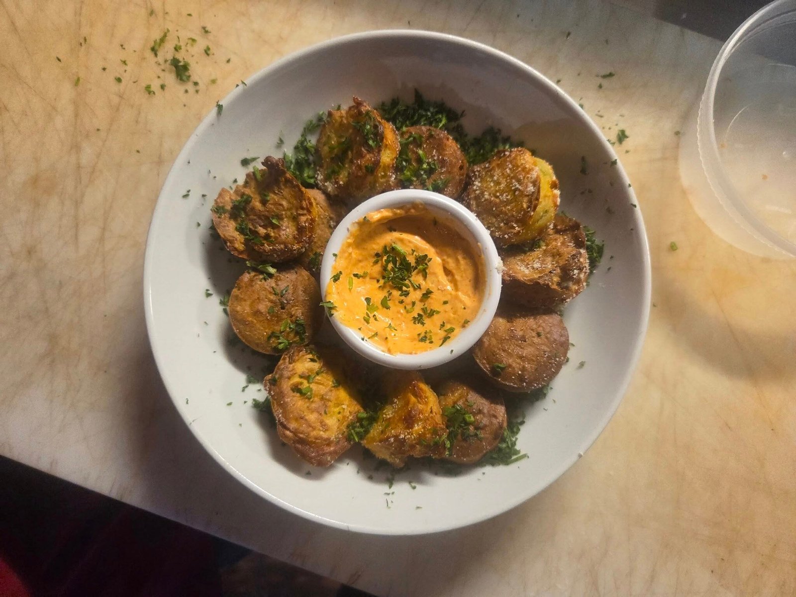 – Placer 10 morceaux au airfryer en mode Roast / Roti pour 3 :30 minutes – Verser dans cul de poule – Soupoudrer de sel et de parmesan en poudre – Placer ramequin avec sauce au centre du bol – Placer les muffins de jalapeno – Éparpiller persil